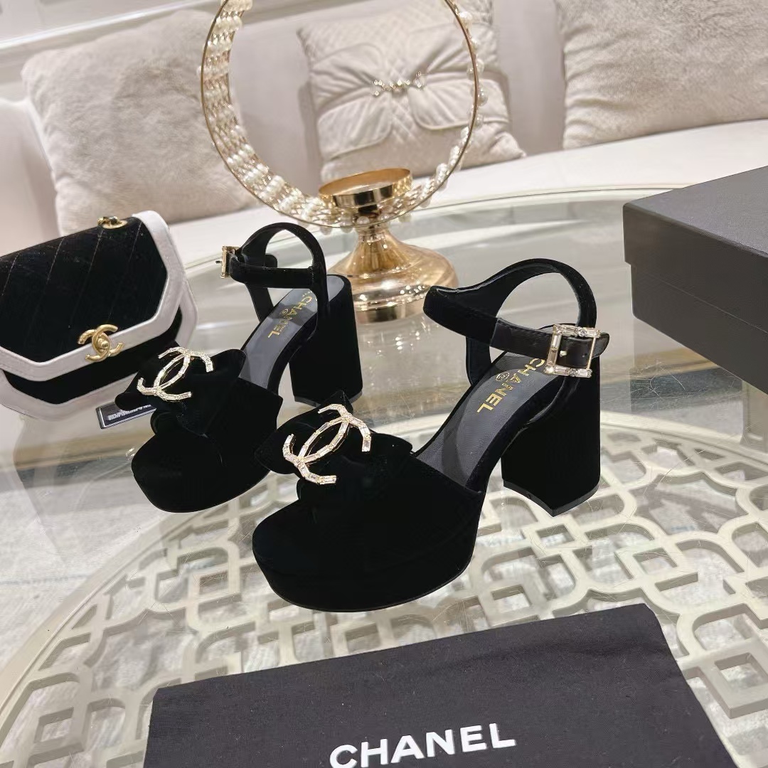 CHANE1 高品質ダブルCロゴベルベット太ヒールサンダル【50%割引+送料無料】