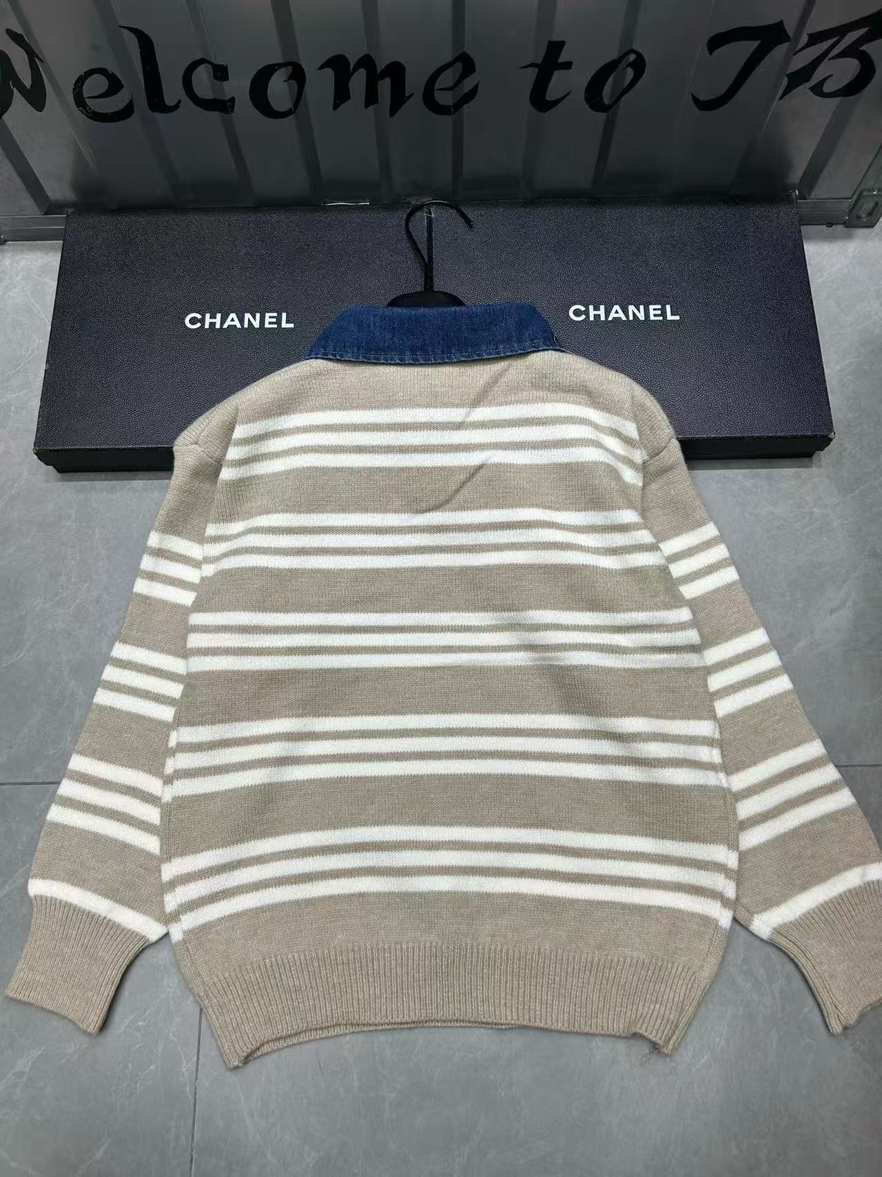 CHANE1 ダブルCロゴ入り襟付きストライプセーター【50%割引+送料無料】