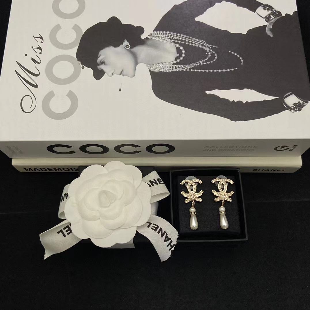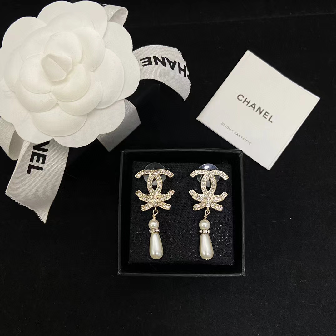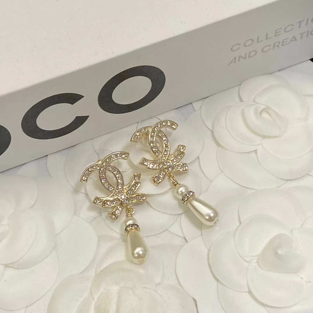 CHANE1 ダブルC ボウドロップパールイヤリング